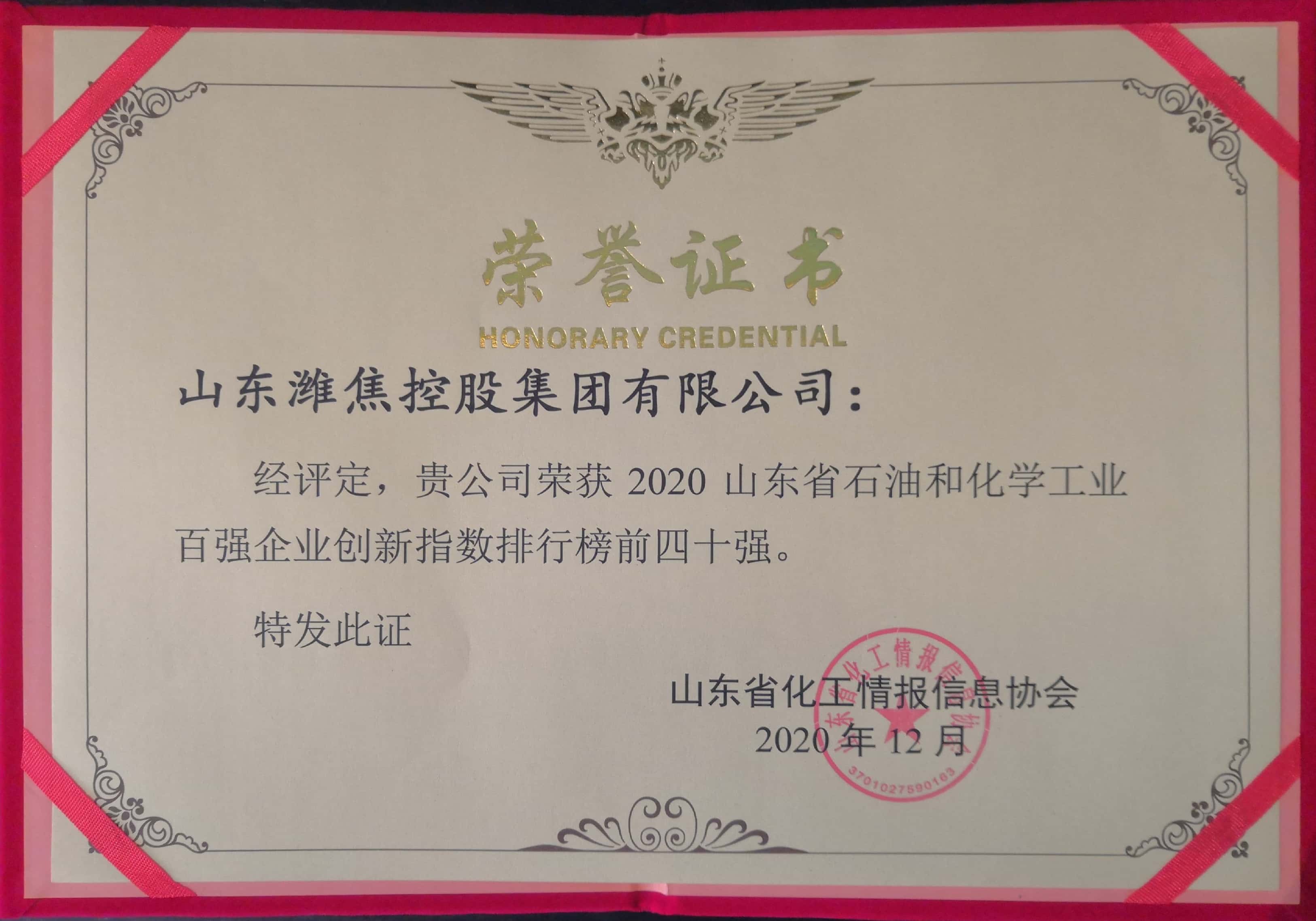 12月16日至17日,由山東省化工情報信息協會主辦的2020(第十屆)中國化工產學研高峰論壇在東營廣饒召開。會上,集團公司榮獲“2020山東省石油和化學工業(yè)100強企業(yè)”稱號,并在百強企業(yè)創(chuàng)新指數排行榜位列35位。