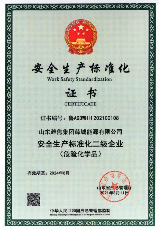 近日,山東省應(yīng)急管理廳發(fā)布山東危險化學品從業(yè)單位二級安全標準化達標公告,山東濰焦集團薛城能源有限公司順利通過二級安全生產(chǎn)標準化審核認定。