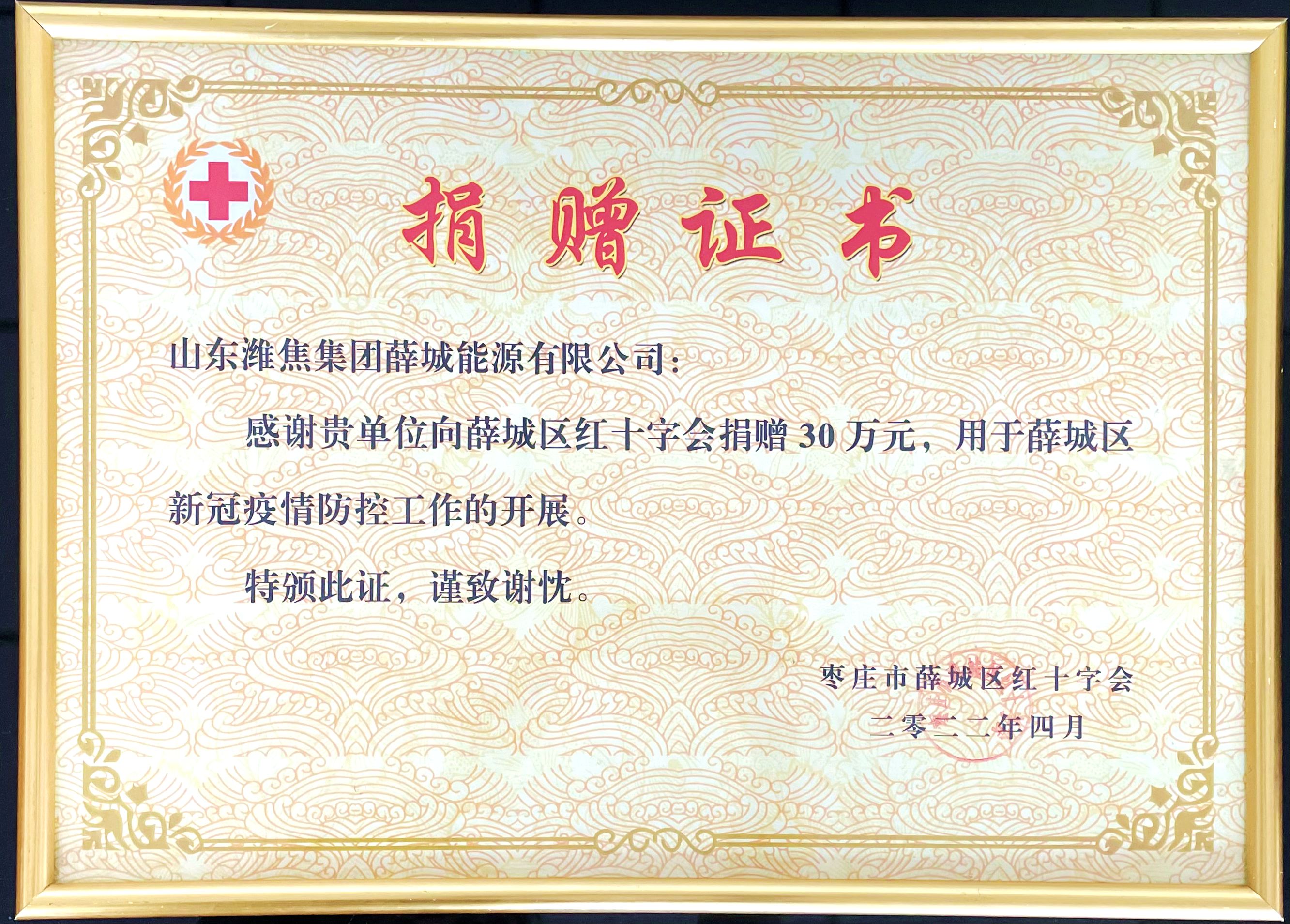 4月11日,薛城能源公司收到棗莊市薛城區(qū)紅十字會頒發(fā)的捐贈證書及區(qū)委統(tǒng)籌疫情防控和經(jīng)濟運行工作領導小組發(fā)來的感謝信,感謝企業(yè)為地區(qū)疫情防控慷慨捐贈30萬元!