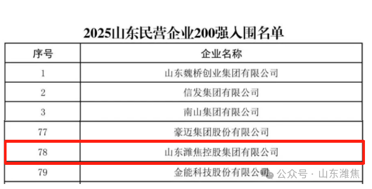 近日,山東省工商聯(lián)、省發(fā)展改革委、省科技廳、省人力資源社會保障廳、省農(nóng)業(yè)農(nóng)村廳、省商務(wù)廳、省稅務(wù)局、省市場監(jiān)管局、省總商會共同組織開展了2025山東民營企業(yè)百強系列榜單發(fā)布活動。山東濰焦控股集團有限公司榮登“2025山東民營企業(yè)200強”第78位。